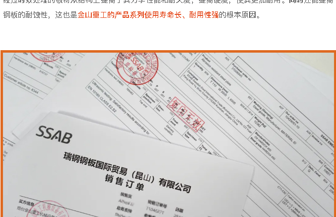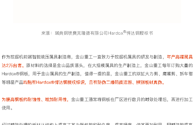 金山重工連續(xù)五年受瑞典鋼鐵奧克隆德有限公司Hardox?悍達(dá)鋼授權(quán)
