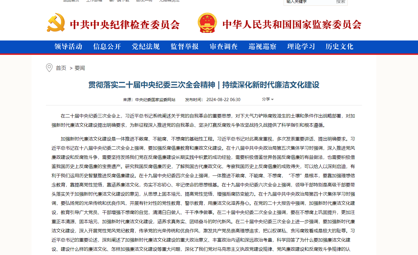 在二十屆中央紀(jì)委三次全會(huì)上,習(xí)近平總書(shū)記系統(tǒng)闡述關(guān)于黨的自我革命的重要思想,對(duì)下大氣力鏟除腐敗滋生的土壤和條件作出戰(zhàn)略部署,對(duì)加強(qiáng)新時(shí)代廉潔文化建設(shè)提出明確要求2024-08-28