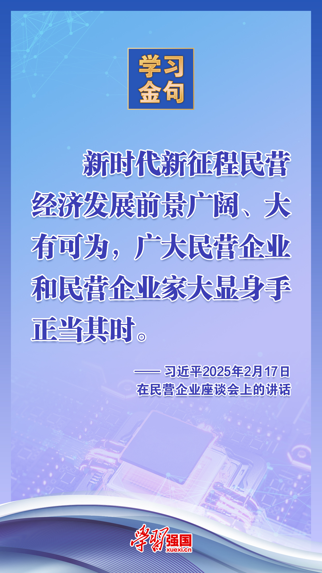 2025年2月17日,中共中央總書(shū)記、國(guó)家主席、中央軍委主席習(xí)近平在京出席民營(yíng)企業(yè)座談會(huì)并發(fā)表重要講話。我們摘錄了其中部分內(nèi)容,一起來(lái)學(xué)習(xí)!2025-02-20